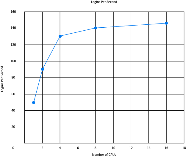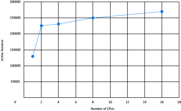 In this test, memory is kept constant at 32 GB and Tomcat is assigned 16 GB for Access Gateway. The number of CPU is increased in the order 1, 2, 4, 8, and 16. The performance is measured at each CPU level.