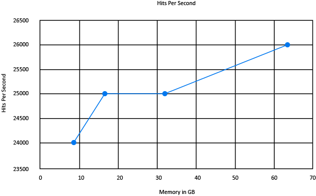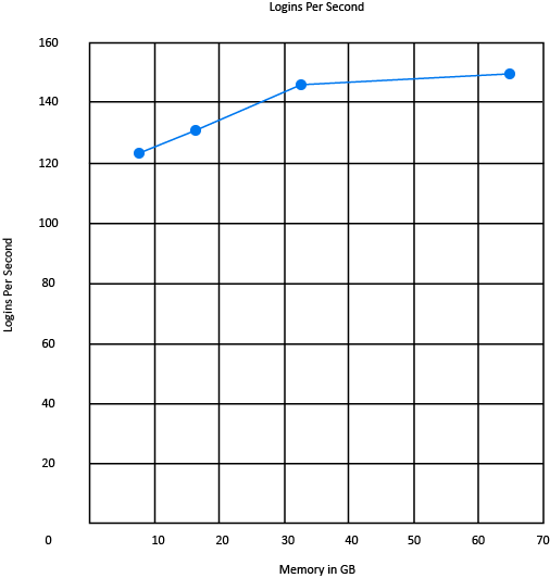 In this test, the number of CPU is kept constant at 16 for Identity Server and Access Gateway. Memory is increased in the order 8 GB, 16 GB, 32 GB, and 64 GB. Tomcat is assigned with 70% of the available memory. Performance is measured at each memory level.
