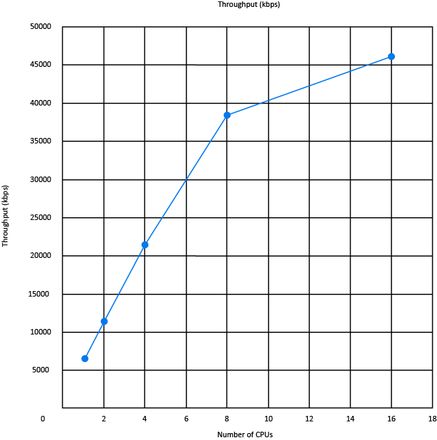 The memory is kept constant to 32 GB and Tomcat is assigned 16 GB for Access Gateway. The number of CPU is increased in the order 1, 2, 4, 8, and 16. Performance is measured at each CPU.