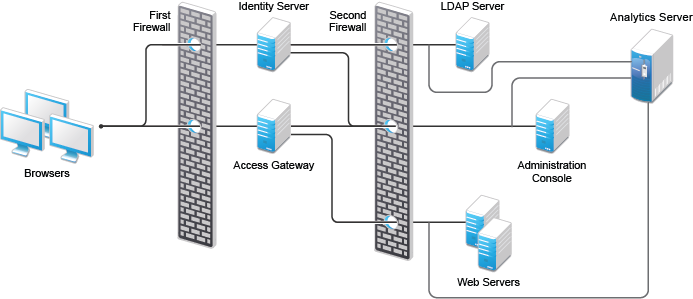 Use Access Manager with firewalls. Figure 1-1 illustrates a firewall setup for a basic Access Manager configuration of Identity Server, Access Gateway, Analytics Server, and Administration Console.