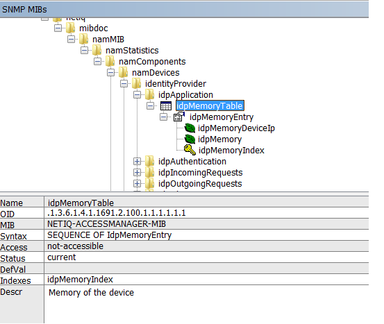This MIB file contains the textual information of Identity Server and Access Gateway attributes. You can use these attributes to monitor the state of the system. The attributes are uniquely identified by an OID or namespace. Figure 28-2 shows the hierarchy of a MIB file viewed with a MIB browser.