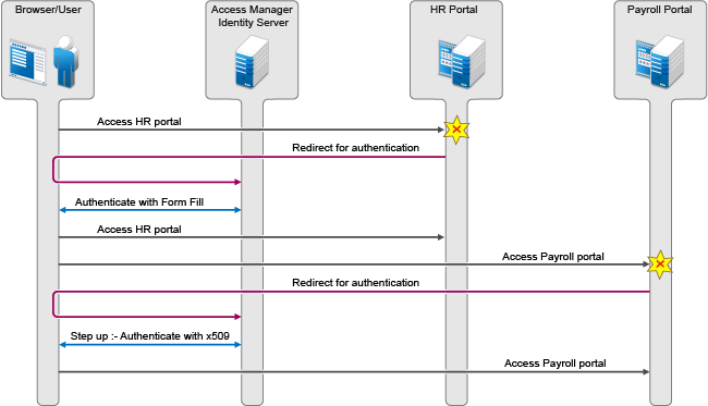 Two web applications, Payroll Portal and HR Portal, protected through different service providers, use Access Manager Identity Server as an identity provider. A user wants to use the name/password form contract to access HR Portal and wants to use the higher level contract X509 for Payroll Portal. Identity Server provides an ability to execute the appropriate contract that has been assigned to the service provider instead of executing the default contract.