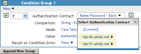 Value: Specify the value you want to compare with the Authentication Contract value. If you select a static value for the Authentication Contract value, select Authentication Contract and Current. If you select Current for the Authentication Contract value, select Authentication Contract, then select the name of a contract.