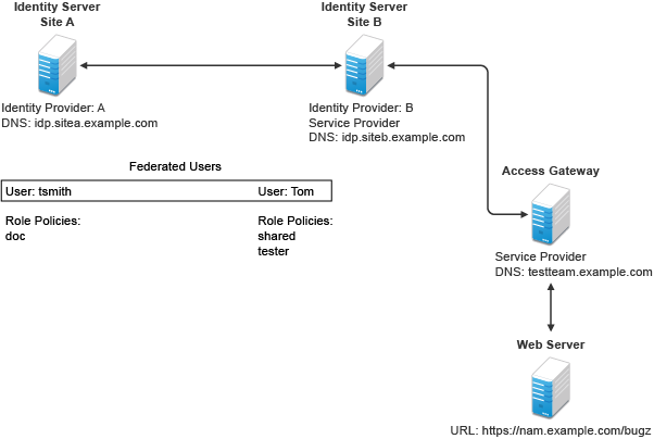 Figure A-3 illustrates a configuration where Identity Server of Site A acts as an identity provider for Site B. When you configure Identity Servers correctly, Access Gateway can use the roles defined for the users of Site A in its policies.