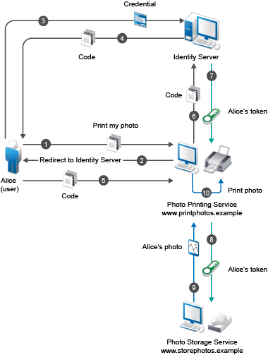 For example, Alice accesses an application running on a web server at www.printphotos.example. She instructs it to print her photographs stored on a server at www.storephotos.example. The application at www.printphotos.example receives Alice's authorization consent for accessing her photographs without learning her authentication credentials of www.storephotos.example. This example is derived from OAuth RFC.