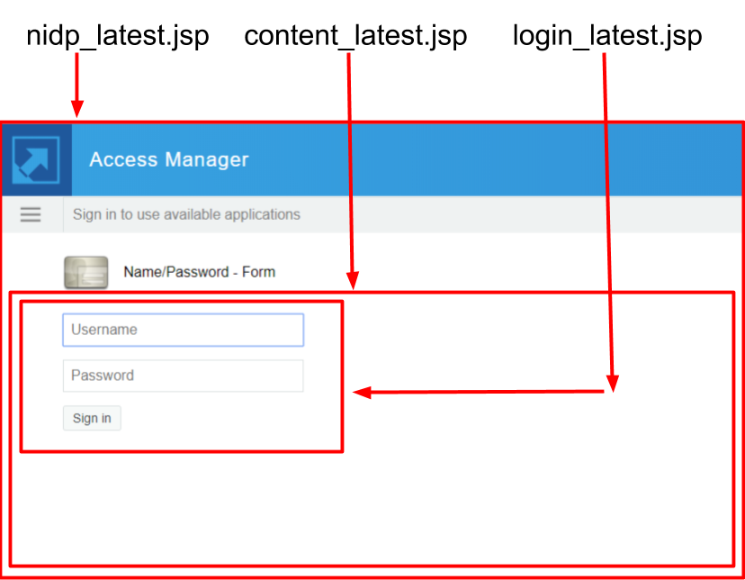• nidp_latest.jsp: This is the main user interface (UI) layout workhorse JSP. It allows formatting of all components that create the Identity Server UI. The HTML div tags with CSS are used for formatting different areas of the UI. These tags can make an AJAX call to Identity Server to display the content <div>. You can customize the majority of your layout in this file.