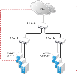 Switches: When you install an L4 switch, you can plug the machines directly into the L4 switch or plug them into an inner switch that is plugged into the L4 switch. When you use inner switches with an L4 switch, you must use at least two inner switches: one for Identity Servers and one for Access Gateways. Identity Server and Access Gateway cannot share the same inner switch. Such a configuration causes communication problems because Access Gateway and Identity Server try to establish direct communication with each other rather than routing all traffic through the L4 switch.