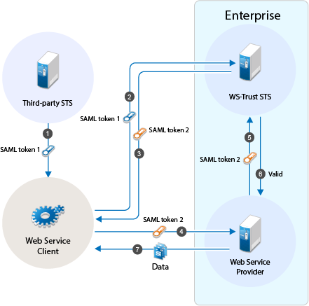 The web service client uses SAML token issued by the third-party STS and requests WS-Trust STS to grant access to resources hosted on the web service provider.
