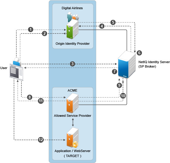 The federation is established between the company and partners’ Identity Provider and the Service Provider Brokering Group that is Novell Identity Server.