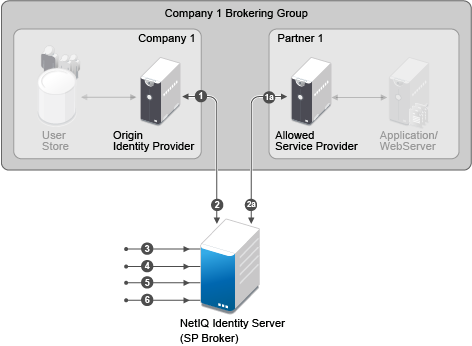 Company 1 Brokering Group is configured with their Service Provider Brokering Group that is Novell Identity Server.
