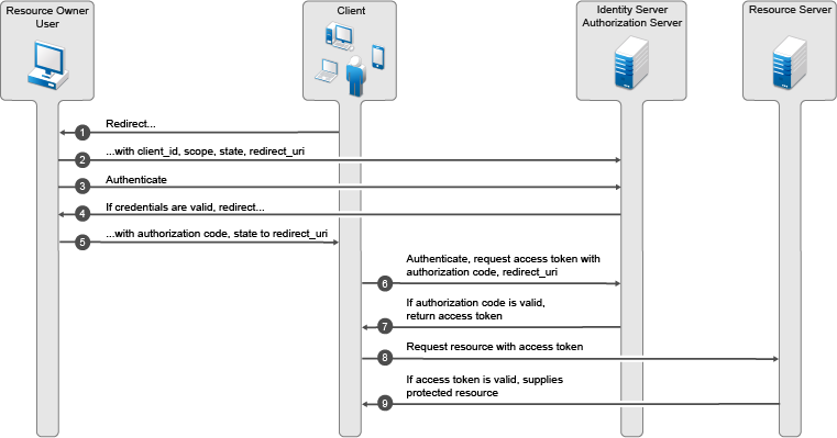 The client application redirects the resource owner to the authorization server through the web browser. The resource owner authenticates at the authorization server. The authorization server obtains resource owner’s consent and then redirects the web browser with the authorization code to the client application.