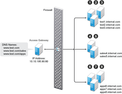 Create the published DNS names with paths for public access to the back-end resources. For example, the table below uses test.com as the domain name. It lists three published DNS names (two with paths), the IP address these names resolve to, and the web servers that they are going to protect: