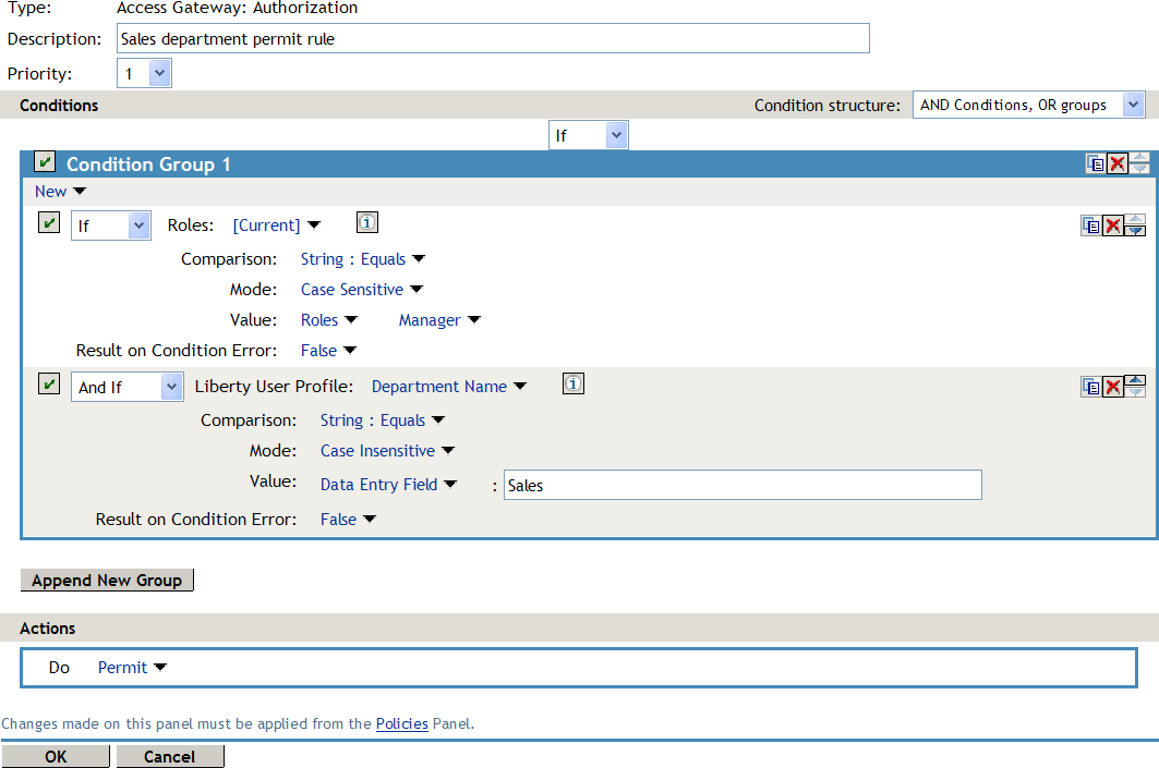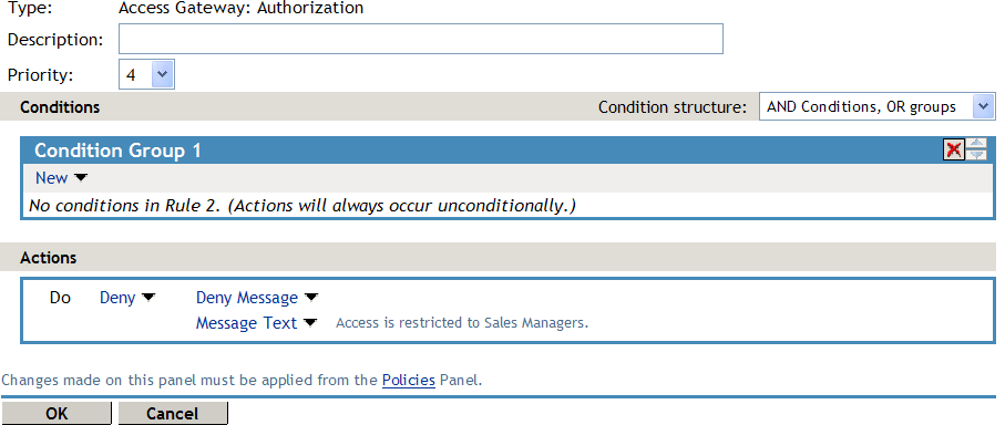 Because this rule has no conditions, any user who does not match the first rule does match this rule and access is denied. The priority of this rule is set lower than the Permit rule so that the Permit rule is processed first.