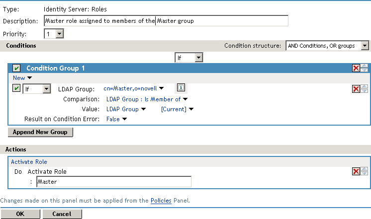 This rule grants a user the Master role if the user belongs to the cn=Master,o=novell LDAP group. If the user does not belong to this group or if an error occurs trying to get the data, the user is not assigned the role. This occurs because both the condition and Result on Condition Error evaluate to false, which prevents the Action from being applied. After creating the Role policy, apply the changes and enable the Role for Identity Server.