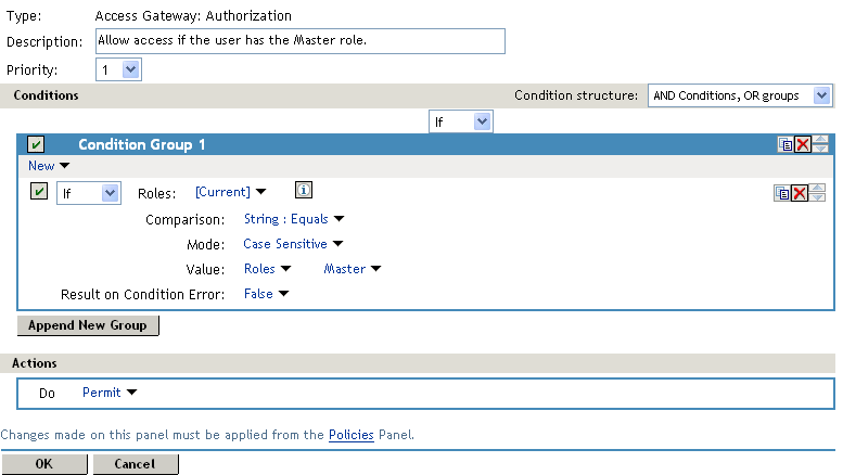 After you save the Authorization policy, you need to assign it to the protected resource or resources that require the Master role, then update Access Gateway.