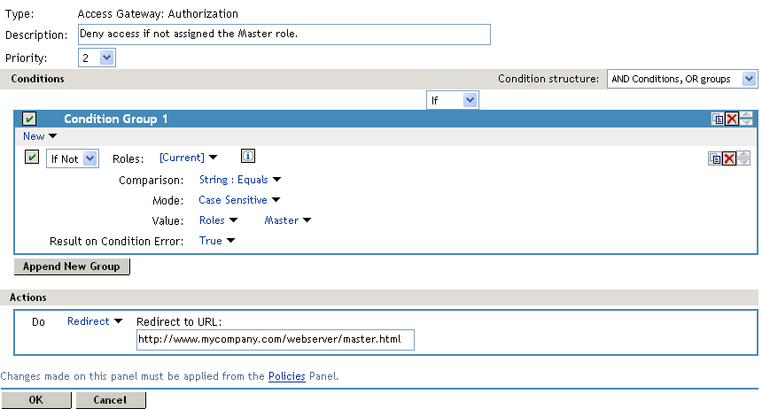 With an If Not condition, the condition evaluates to True when a user does not match the condition. With such a rule, you want Result on Condition Error to also evaluate to True. If an error occurs obtaining role information for the user, the rule must not assume that the user had the Master role. The rule needs to assume that the user had no roles. You want the error condition to evaluate to True. Because the condition evaluated to True, the Action is applied to the user. The value specified in Redirect to URL must specify the page that contains the information about how to request access.