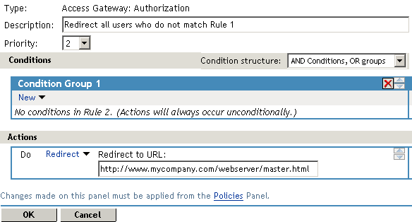 This redirect rule can be the only rule in the policy, because the users who are assigned to the Master role do not match the rule and are allowed access.