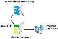 In addition to setting up trust with internal or external service providers, you can reference ESPs in your enterprise. An ESP uses the Liberty protocol and does not require metadata entry, because this exchange happens automatically. The ESP comes with Access Manager and is embedded in Access Gateways. The ESP facilitates authentication between Identity Server and the resource protected by the device, as shown in as shown in Figure 2-18.