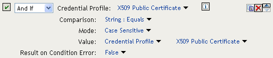 The policy engine evaluates the above condition to true when the Credential Profile contains a value for the certificate. If the user used another method for authentication, the certificate field is empty, and the policy engine evaluates two null entries to false.