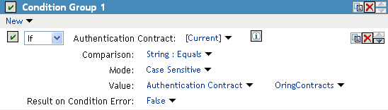 If the contract with ORed credentials was named OringContracts, the first condition in the rule must look similar to the following: