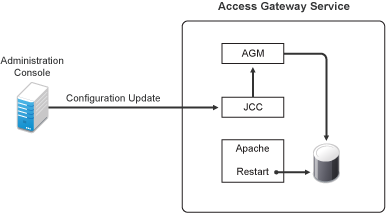 JCC sends the configuration changes to Access Gateway Manager (AGM), which writes the Apache configuration to disk. Apache is sent a restart command, which causes Apache to read the new configuration, then Apache validates the configuration.