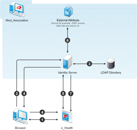 e_Health is a web portal for doctors. e_Health uses Med_Association as an external identity provider to verify whether the user is a doctor and obtain the user's professional code and specialization. Med_Association retrieves these details with the help of Access Manager Identity Server.