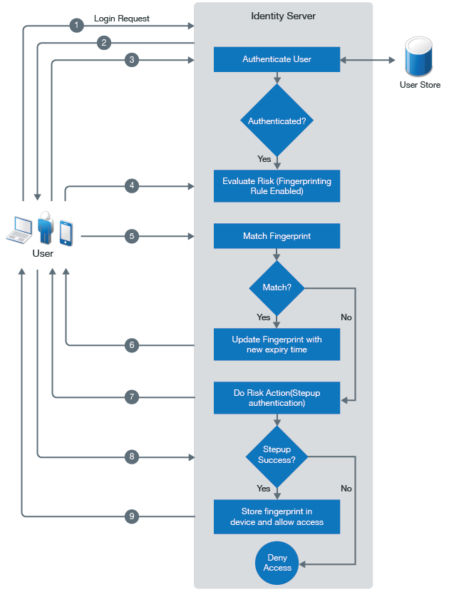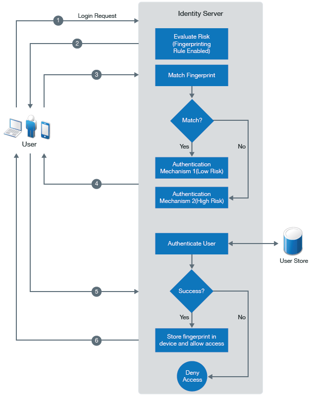 When a user logs in the first time, the user needs to provide an additional authentication. After the first successful authentication, Identity Server calculates the fingerprint for a device by using various user and device attributes, and registers the device. In subsequent login attempts by the same user, Identity Server validates the device by using the stored fingerprint.