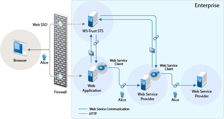 In this scenario, a web service client that resides as part of a web application within an enterprise tries to access services from other web service providers of the same enterprise. A user named Alice accesses to the web application through a browser and needs single sign-on access to other applications.