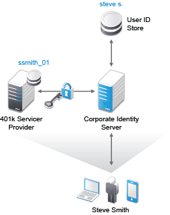 The 401k application uses the assertion or token to validate that steve s. is ssmith_01 and authorizes the authentication (resource request).