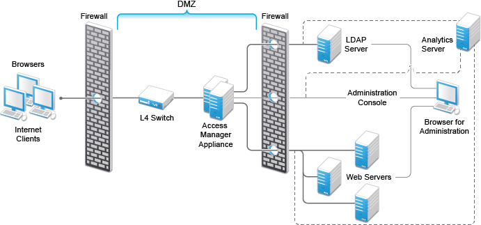 The first firewall separates Access Manager Appliance from the Internet, allowing browsers to access the resources through specific ports.The second firewall separates Access Manager Appliance from web servers they are protecting .