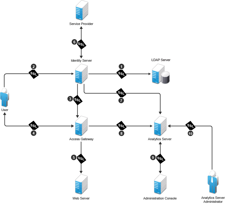 The first channel is set between Identity Server and LDAP servers when you configure user stores. The other channels are configured according to their numeric values. SSL must be configured between Identity Server and browsers before you configure the channel between Access Gateway and Identity Server for SSL.