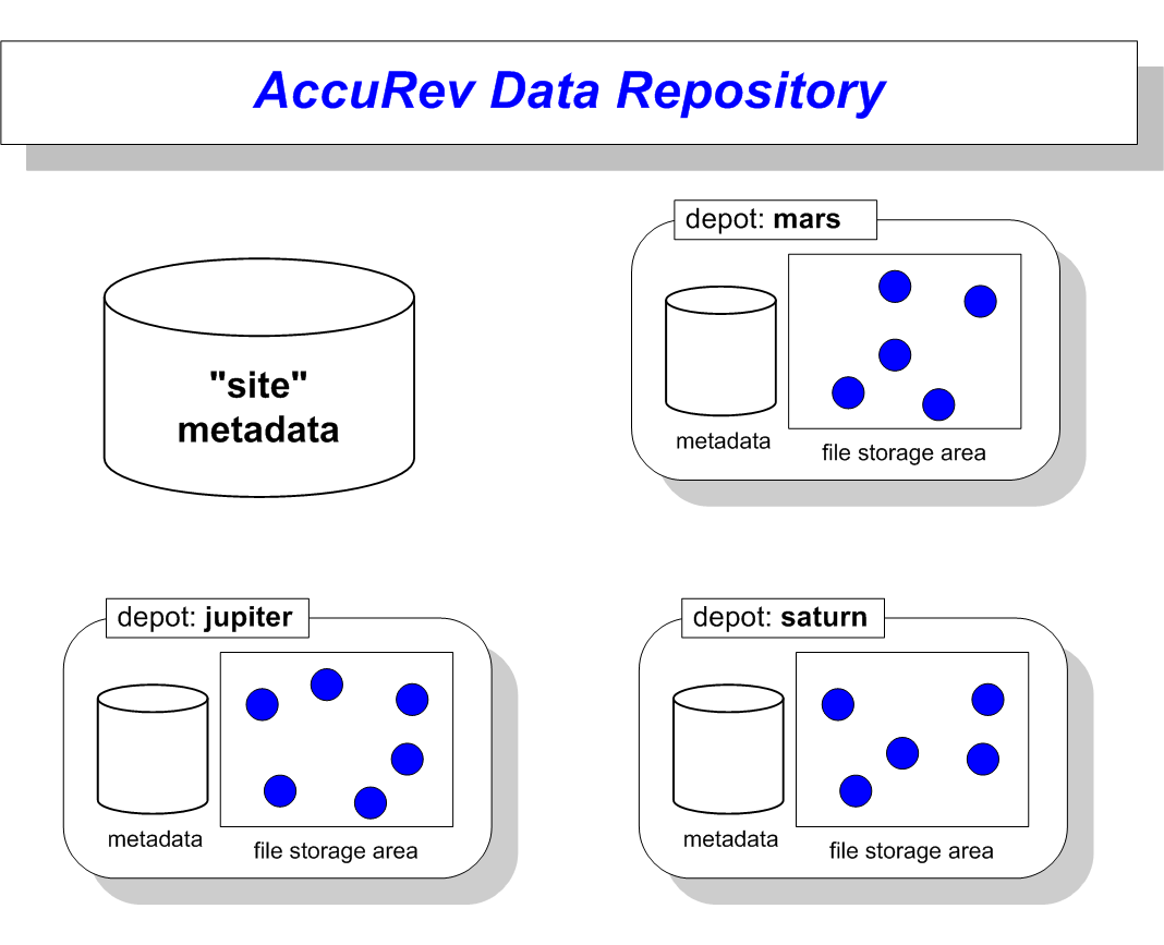 The illustration below shows the modular structure of the AccuRev data repository. Logically, the entire repository is located on the machine where the AccuRev Server program runs, but only the accurev database must physically reside on the server machine. The file storage areas — which typically are far larger than the databases and grow far faster — can be located elsewhere. For example, the file storage area of depot