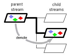 You can demote by transaction, issue, or file. When you demote by transaction, the specific versions of the files in that transaction are moved from the parent stream to the child stream you specify. If you demote by issue, you move the changes associated with that issue from the parent stream to the child stream. When you demote by file, the demoted file is removed from the default group of active files in the parent stream and added to the default group of active files in the child stream. For more information, see Demote: Moving Elements Out of a Stream.