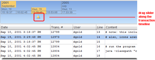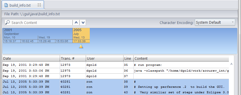 The Annotate command lists the entire contents of the selected version of a text file, annotating each line with:A version timeline makes it easy to view the contents of any version of the text file.