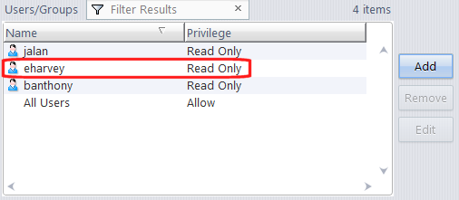 6. If you selected a directory in Step 1, AccuRev asks whether you want to apply the privilege recursively to all elements in that directory. See Setting Permissions on a Directory on page 271 for more information on this topic.The change you made appears in the Users/Groups list box. Here, for example, we see that the privilege for user eharvey has been changed from Allow to Read Only for the element selected in Step 3: