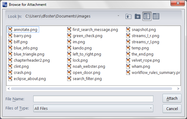 The Browse for Attachment dialog allows you to browse for files to attach to an issue record when in a field of type Attachments.