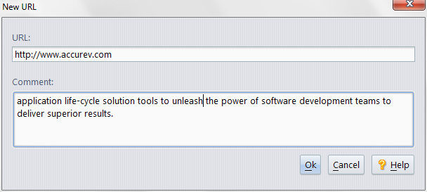 The New URL Attachment Dialog The New URL Attachment dialog defines one or more URL attachments in an issue record field of type Attachments. Invoking the New URL Attachment Option Click the New URL Attachment icon in the toolbar of the Attachments field in an issue record's Issue form. Using the New URL Dialog Fill in these fields to define one or more attachments: URL A full Web address. Comment Any text string.