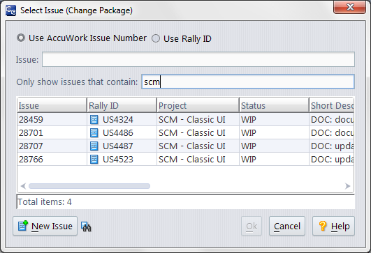 Note: If you have enabled the use of third-party ITS keys in the AccuWork schema, the Select Issue (Change Package) dialog displays additional controls that let you specify whether you want to use AccuWork issue numbers or third-party keys when selecting issues to promote against. See