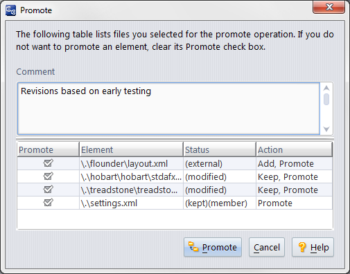 Tip: Although you can promote files from the Explorer, Outgoing Changes, and Conflicts modes, consider using the Outgoing Changes mode to see all the new work and changes you might want to promote to the parent stream.