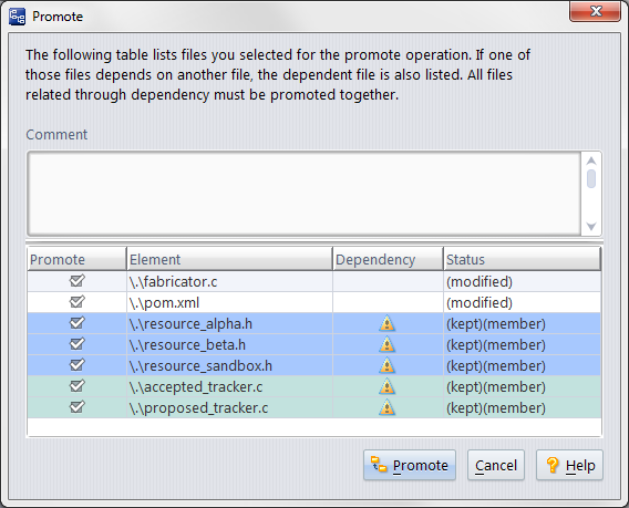 Dependent elements are displayed with a warning icon in the Dependency column. Elements that share a dependency are highlighted using the same color. Because dependent elements must be promoted together, clearing the