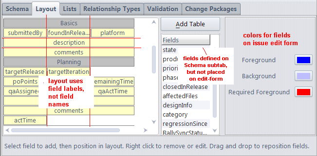 The Layout subtab provides a drag-and-drop canvas on which you design the Issue form's rows and columns. On this canvas, each field-label/edit-widget pair is represented by a yellow box.