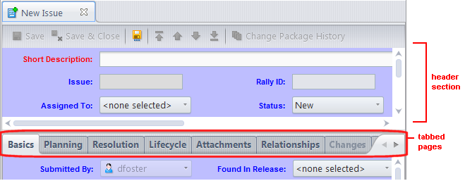 An Issue form consists of field-labels and corresponding edit-widgets, arranged in rows and columns. The field-labels come from the Labels column of the Schema Fields table (Schema subtab). The edit-widget for a field depends on its data type and, in some cases, on the additional Field Value information.