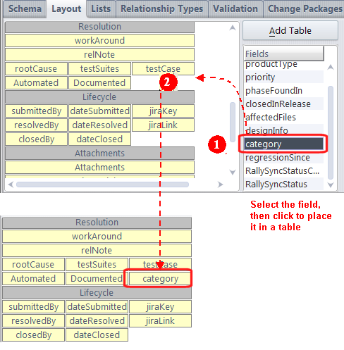 Click the Add Table button above the Fields list-box. Fill in the Table Title field in the dialog box that appears, then click OK . This title will appear on the page's tab in the Issue form.