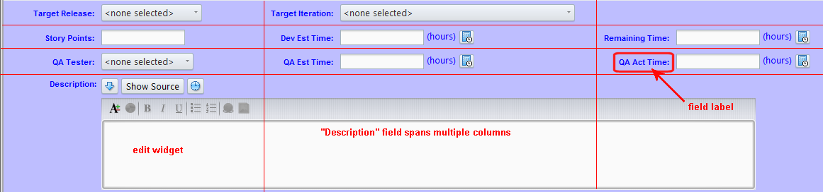 As the screen-shot annotations indicate, the yellow box contains a field-name (e.g. actTime), not a field-label (Actual Time). On the Issue form, the field-label and the corresponding edit-widget will appear, side by side, at this position. You can also expand a yellow box to make it span two or more columns.
