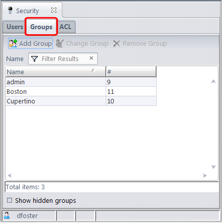 The Groups subtab of the Security tab displays the repository's set of user groups. Individual users can be members of any number of groups. Likewise, a group can belong to -- that is, be a subgroup of -- any number of other groups.Choose Admin > Security from the GUI main menu to display the Security tab. Then, click the Groups subtab.(appears if Show hidden groups is checked) Inactive indicates that the group has been Removed, and can't be used in the definition of an ACL entry or a lock. A removed group can subsequently be Reactivated.The group name. You can change a group name (for example, from sptgrp to sport_group) without disrupting AccuRev's bookkeeping, because it tracks group identities by their unique, immutable integer IDs.A group name can be up to 96 characters long. A group cannot have the same name as any other group, or the same name as any user. See User-Specified Names for AccuRev Entities on page 23.The integer that uniquely identifies this group. This number cannot be changed. Note: The same "namespace" of integer IDs is shared by users and groups.If checked, the table includes group that have been deactivated with the Remove command. This also adds a Status column.To specify a group's membership, select one or more users and/or groups, and click theor