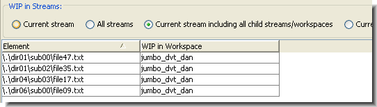 WIP: Identifying Work in Progress The WIP ("Work in Progress") tab shows elements that are currently active in the workspaces below a specified set of one or more streams. (A stream's own default group is not included in this listing.) Opening a WIP Tab Select a dynamic stream in the StreamBrowser, and choose WIP from its context menu. WIP Tab Layout Element (or separate "Name" and "In Folder" columns) The element's pathname within the depot. WIP in Workspace The workspace in which the element is active. Working in a WIP Tab Use radio buttons to specify which stream -- or set of streams -- whose workspaces are to be searched for active elements: Current stream The stream you selected when invoking the WIP command. All streams All streams in the depot. Current stream including all child streams/workspaces The entire subhierarchy of streams below the one you selected. Current stream including all parent streams/workspaces The entire backing chain of the stream you selected. A workspace is searched for active elements if it is a direct child of one of the streams you've indicated with your radio-button choice. (But pass-through streams are ignored when determining the "direct child" relationship. Workspaces whose parent is a pass-through stream are treated as if they were backed but their "grandparent" stream.) The WIP tab display is informational only. You cannot change the status of elements from this tab. See also: Working with Tables on page 14.