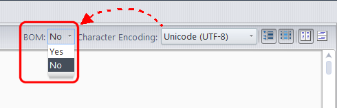 • BOM: A BOM (Byte Order Mark) is part of the Unicode standard used to indicate the endianness of a text file, and which Unicode encoding is in use (UTF-8, UTF-16, or UTF-32. for example). The BOM drop-down is displayed only when you are merging Unicode files, as shown here:This can happen because the native encoding is Unicode, or if you use the Character Encoding field to explicitly set a Unicode encoding.When the BOM field is set to Yes, the output file of the merge will be written with a leading BOM indicator from the Unicode standard. When the BOM field is set to No, the output file will be written without the leading BOM. If either contributor to the merge has a BOM in it, the BOM field defaults to Yes; otherwise it defaults to No.(Appears for file with .htm or .html suffix only) Toggle switch: display the context of the merged version as plain text, or render the contents as HTML.