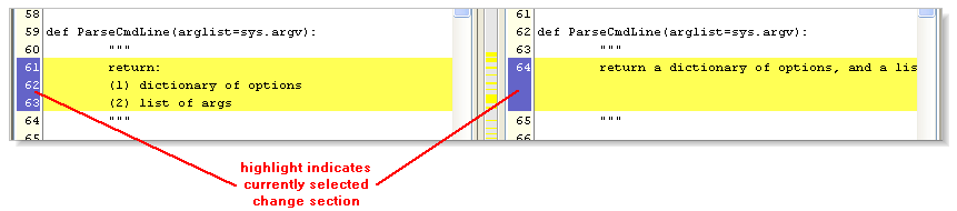 • If theMy changes mode button is selected, the navigation buttons traverse just the change sections in which the right-hand (or lower) contributor differs from the closest common ancestor.