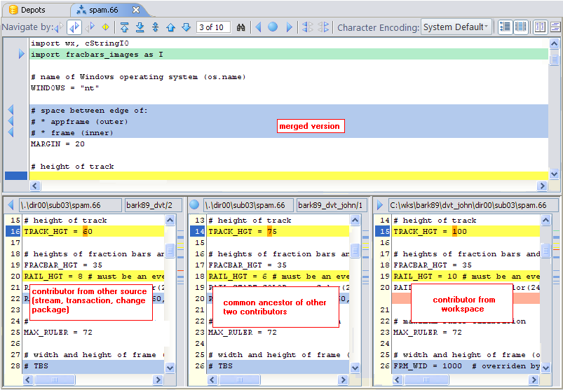 • For a conflicting change, the blocks in all contributors are colored yellow, no matter what the navigation mode is.Example 1: In My changes navigation mode, non-conflicting additions that come from your version are colored green; non-conflicting additions that come from the other contributor are colored gray. In Their changes navigation mode, the color-coding of non-conflicting additions would be reversed.Example 2: In Conflicts navigation mode, all conflicting changes are colored yellow; all other change sections are colored gray.The merged version is displayed with color-coding, too. Each colored block is a location where a change has been incorporated from one of the contributors into the merged version. When it starts, the Merge tool performs as much merging as it can automatically, applying all of the non-conflicting changes to the merged version. The text is always colored gray. Annotations in the left margin indicate the origin of the change:The Merge tool cannot resolve conflicts automatically, so the location of each conflict is initially indicated in the merged version by a blank yellow block. As you make selections to resolve the conflicts, the blank yellow blocks get filled in with the selected text and are annotated: