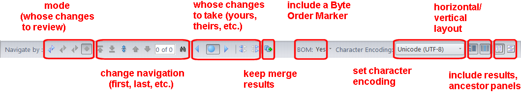 For example, "2 of 4" might mean "you are currently in My changes mode, and you are currently at the 2nd of 4 such changes".In addition to navigating among the change/conflict sections, you can search for any text string in any pane, using theSearch toolbar button (keyboard shortcut: Ctrl-S).